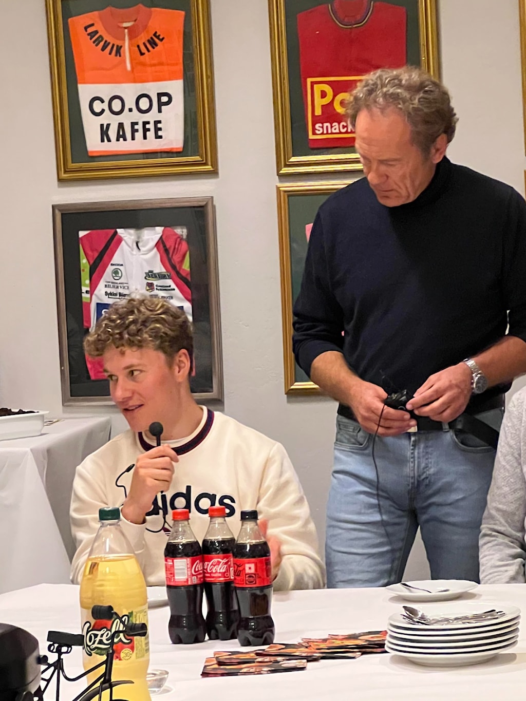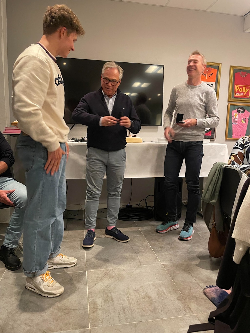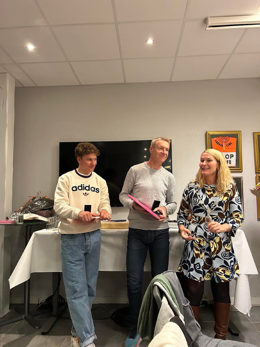Jonas og Jørn får tildelt GSK hedersmerkeOrdfører Hedda Foss Five ville takke på vegne av kommunenordfører og kultursjef Guro Honningdal overrekker blomster på vegne av kommunenSkikkelig bløtkake som seg hør og børJon Rangfred intervjuer Jonas og JørnHyggelig samtale mellom Harald Tiedemann, Thor Martin Gunstad og Øystein EriksenDet var folksomt på medlemsmøtetSKRYT: Jonas Abrahamsen og Jørn Fjeldavlie fikk skryt av kultursjef Guro Honningdal og ordfører Hedda Foss Five under onsdagens medlemsmøte i Grenland Sykleklubb.