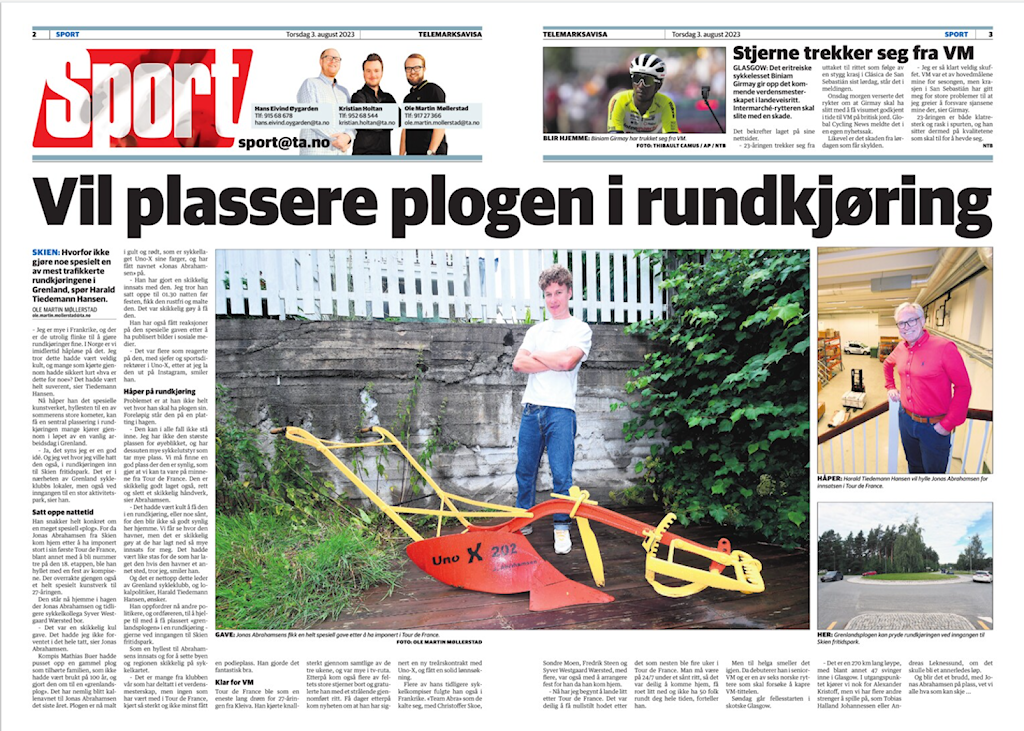 Kompis Mathias Buer hadde pusset opp en gammel plog som tilhørte familien, som ikke hadde vært brukt på 100 år, og gjort den om til en «grenlandsplog». Det har nemlig blitt kallenavnet til Jonas Abrahamsen det siste året. Plogen er nå malt i gult og rødt, som er sykkellaget Uno-X sine farger, og har fått navnet «Jonas Abrahamsen» på.